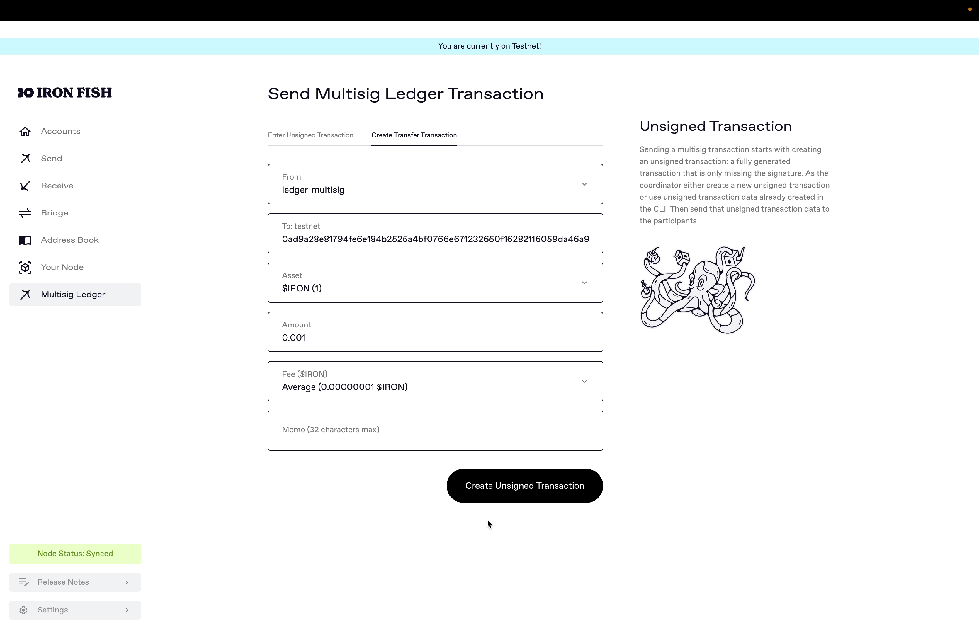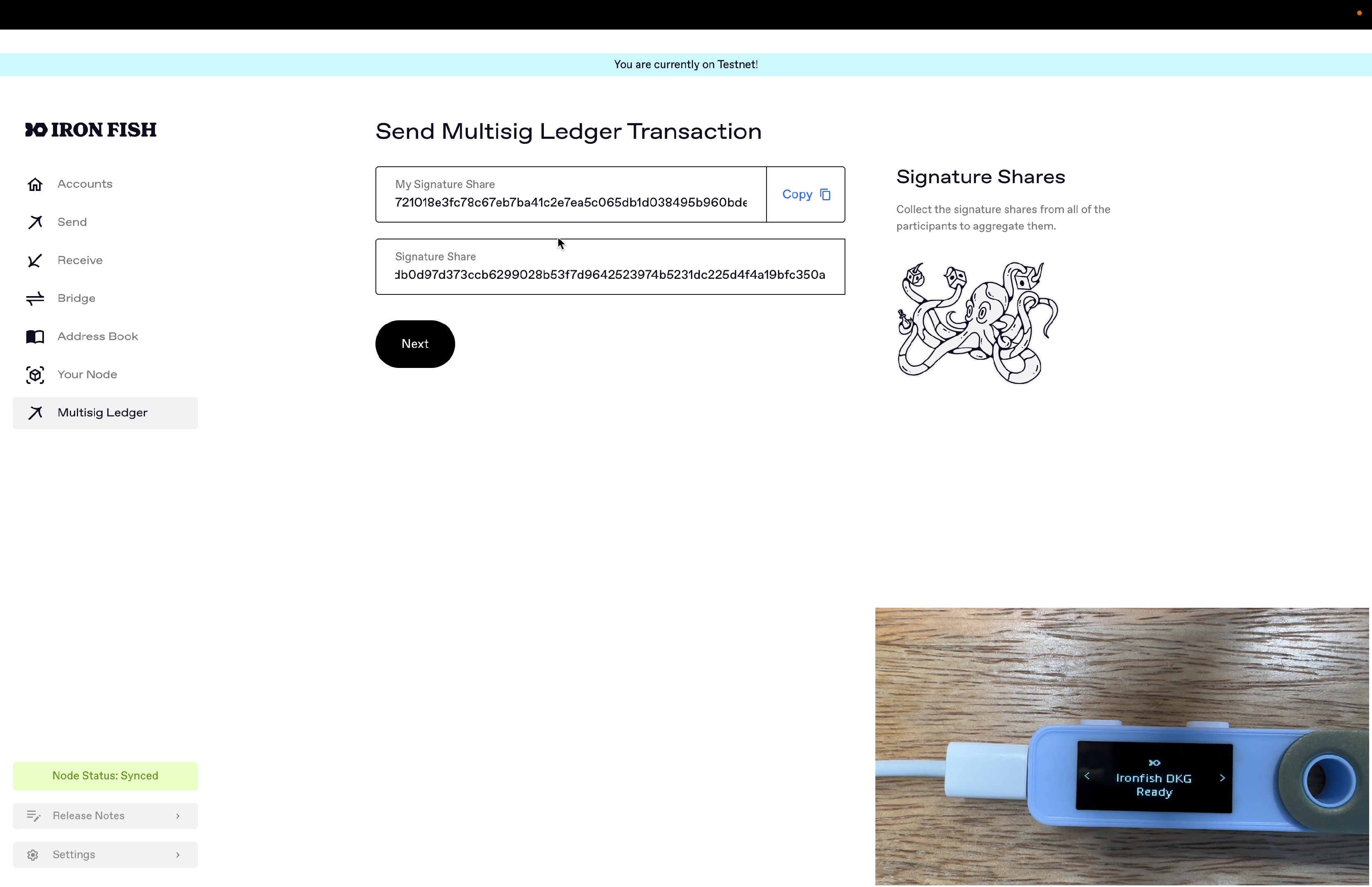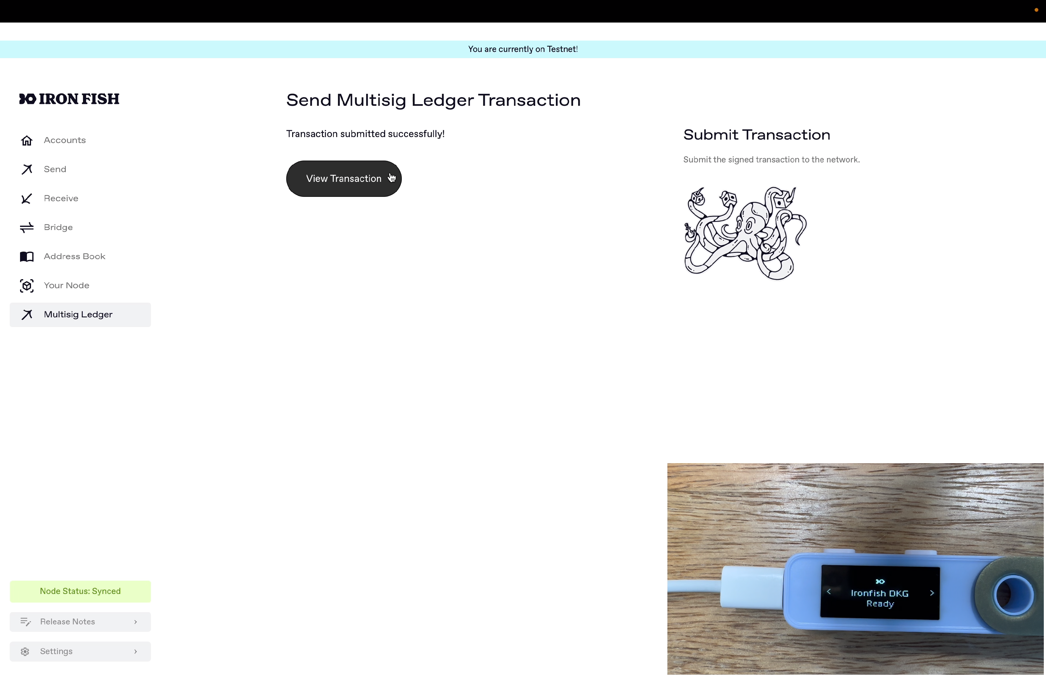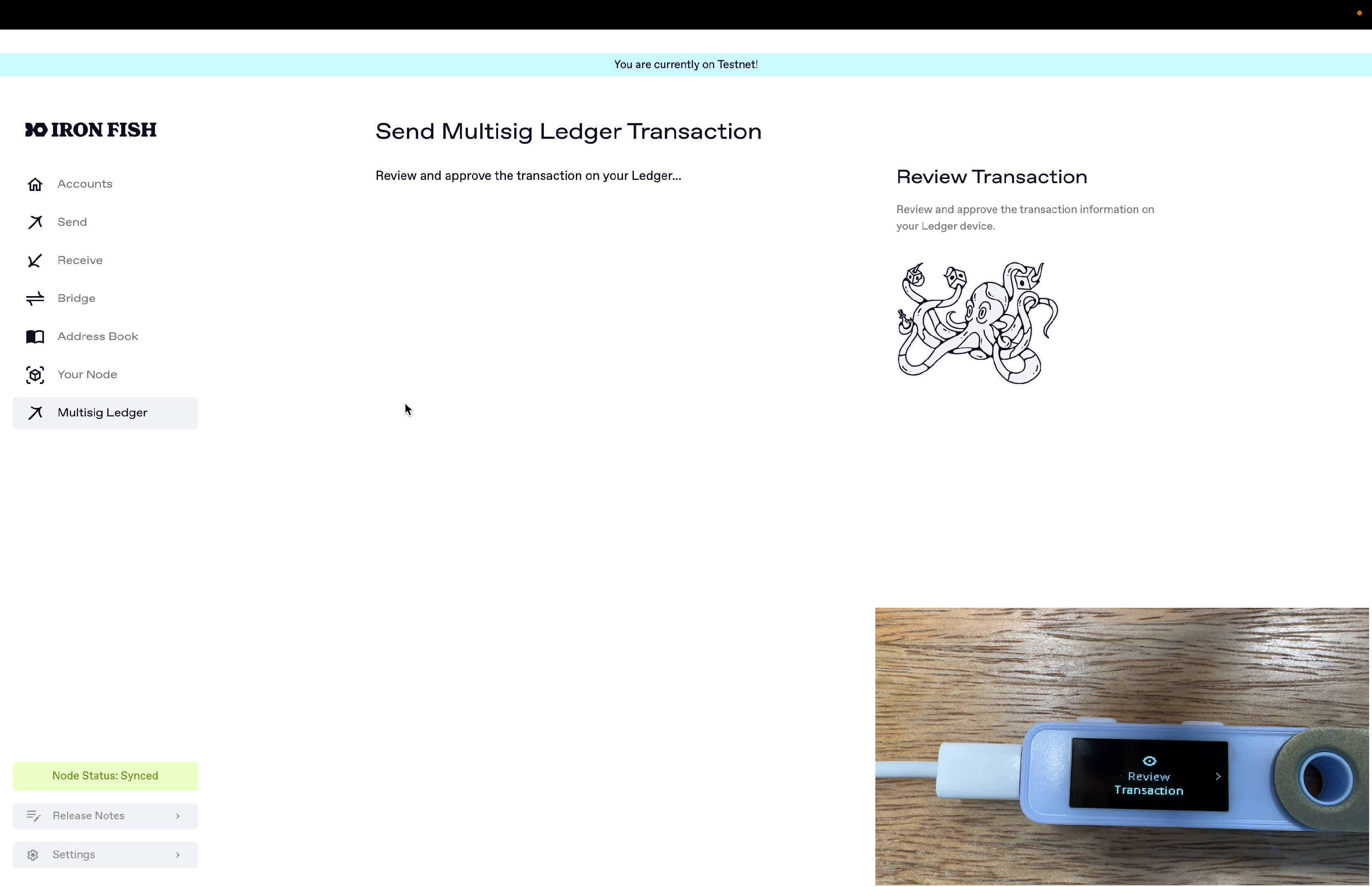 After adding your Ledger multi-sig account into the Iron Fish Node App, we can then construct unsigned transactions for that multi-sig wallet in the Node App, use the Ledger device to product a signature share, and then aggregate signatures from other participants to sign and broadcast it out.