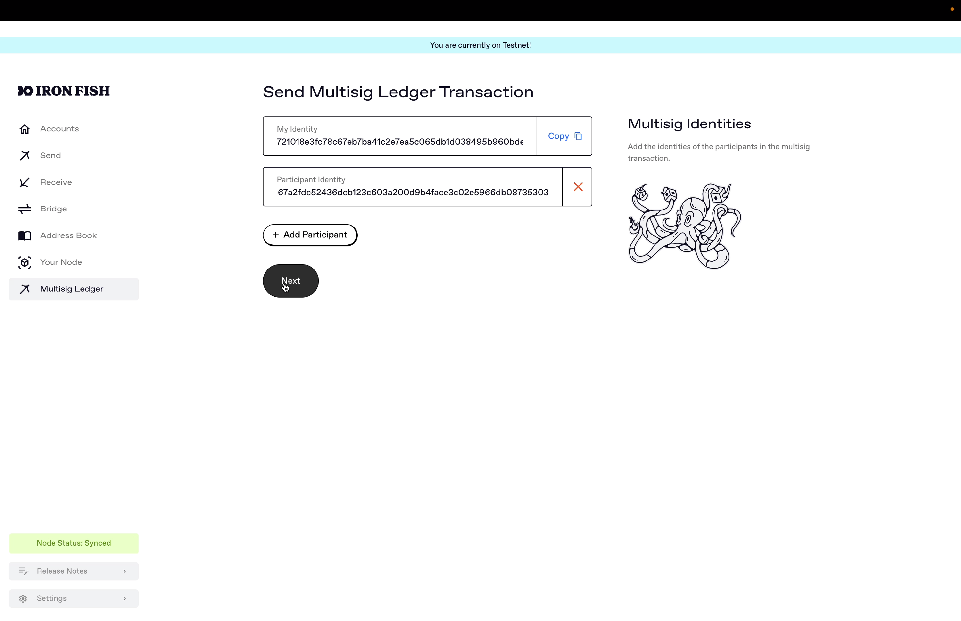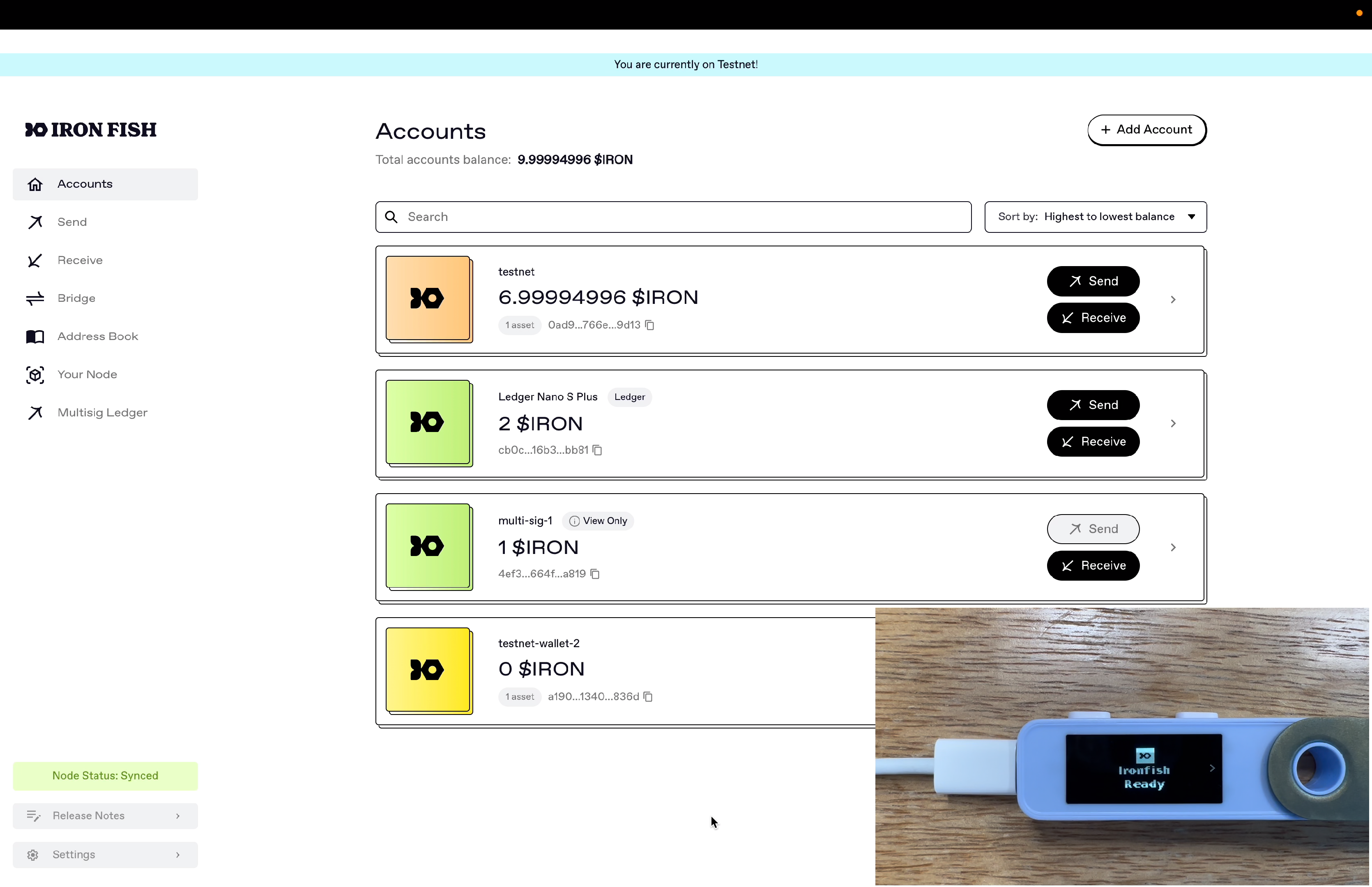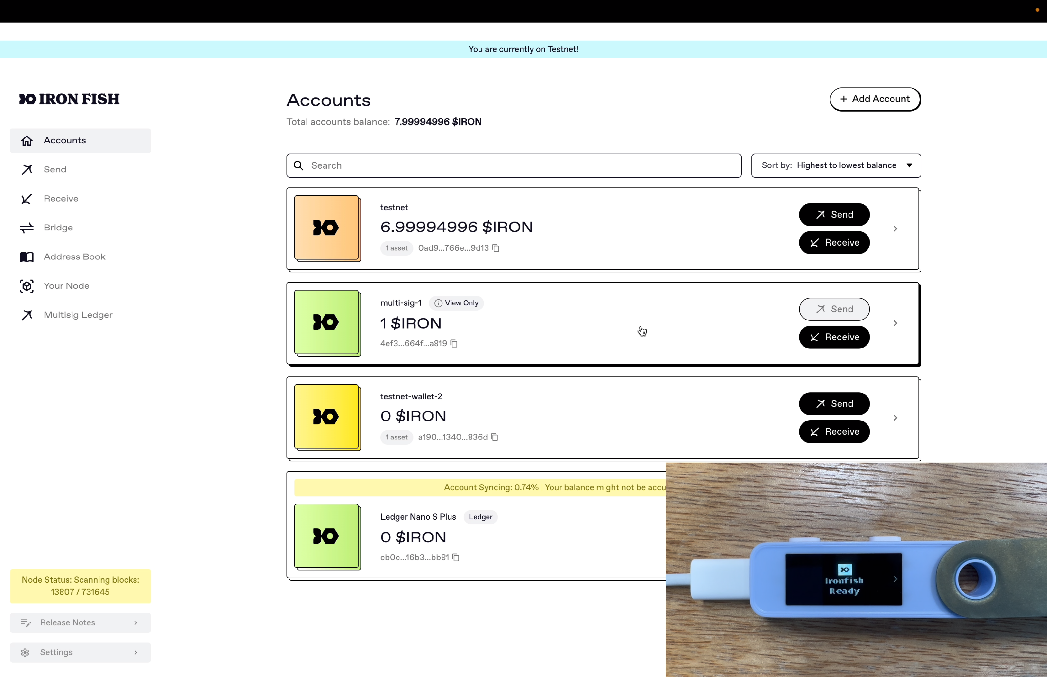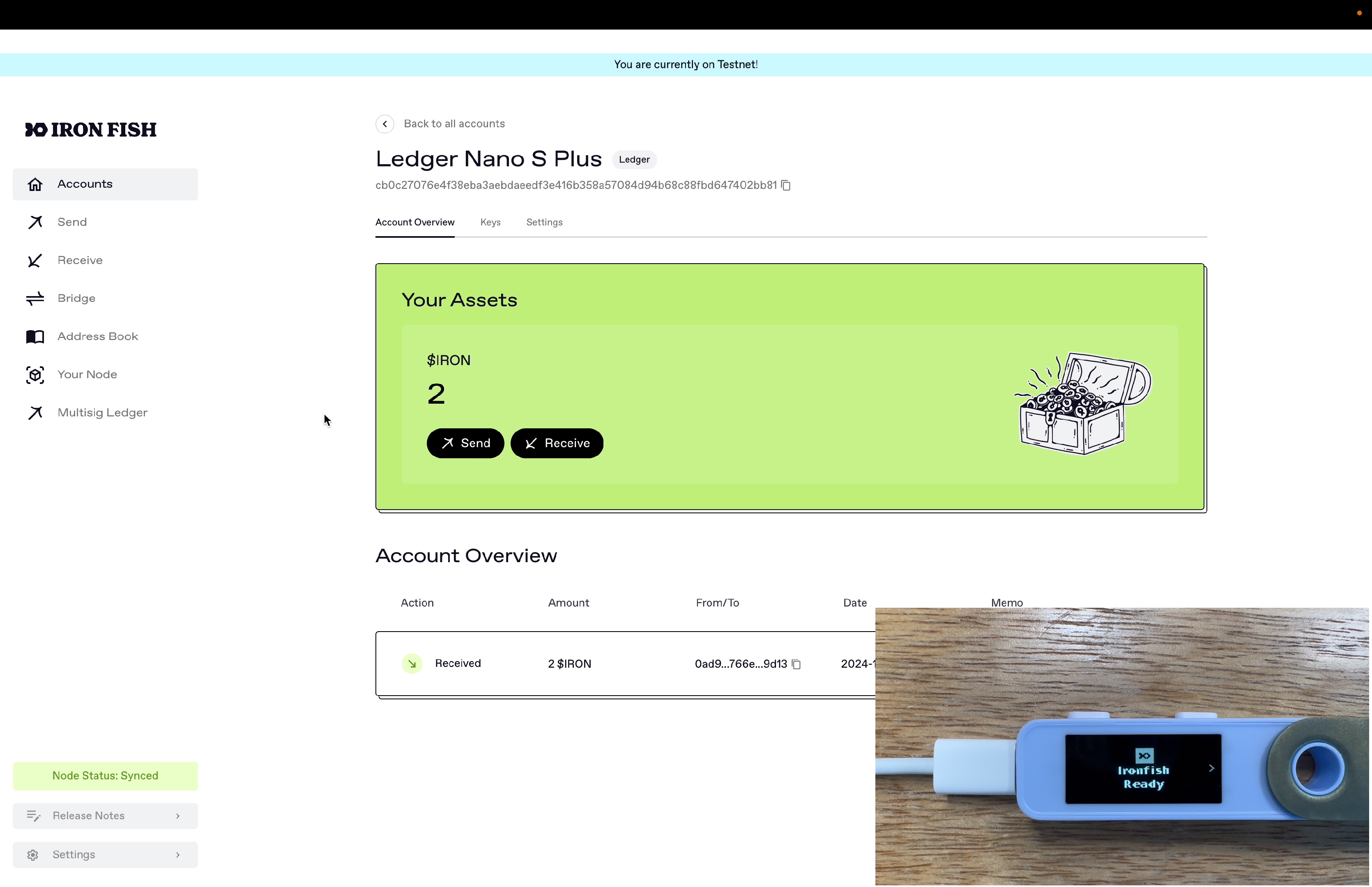 After adding your Ledger multi-sig account into the Iron Fish Node App, we can then construct unsigned transactions for that multi-sig wallet in the Node App, use the Ledger device to product a signature share, and then aggregate signatures from other participants to sign and broadcast it out.