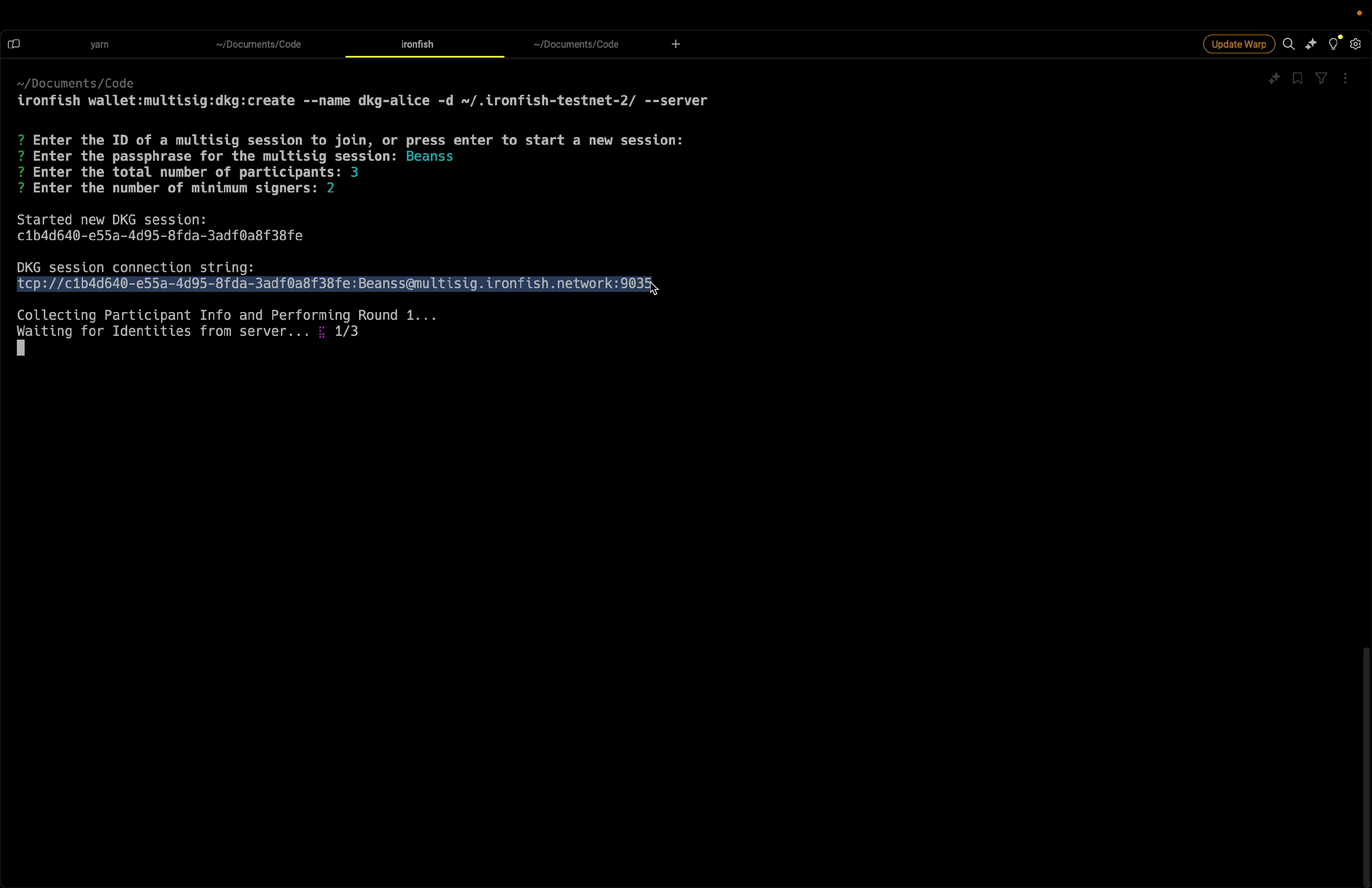The initial output of this command will give you a DKG session connection string that you can give to other participants to streamline the interactive part of making a multi-sig wallet: