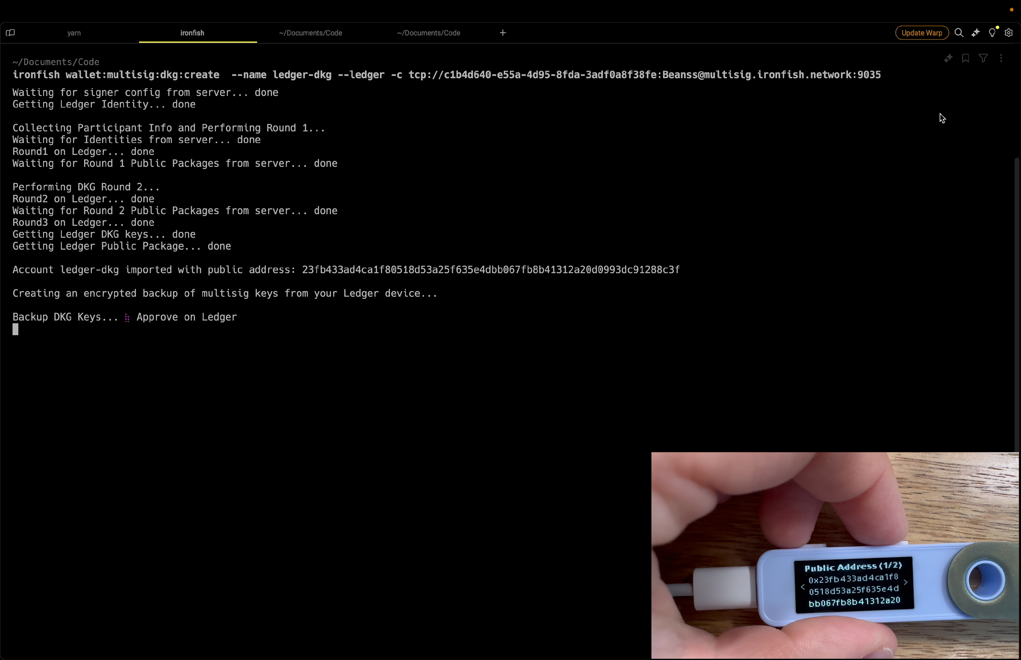 After approving the three interactive Rounds on your Ledger device, you’ll see the prompt to save your Backup DKG Keys on the Ledger device and verifying once again that you’ve created a 2 of 3 multi-sig account and its newly created public address. This public address can now be used to receive funds.