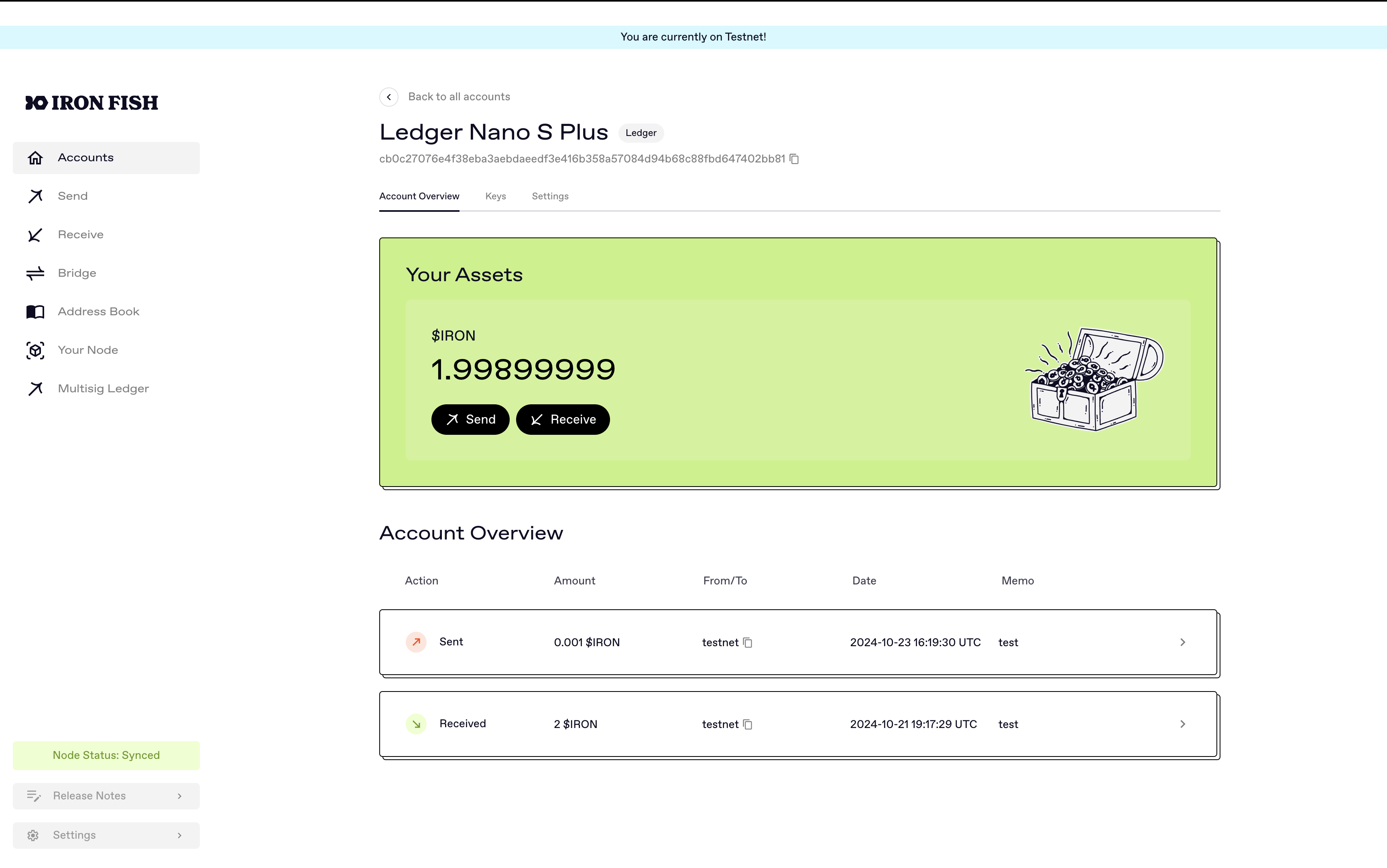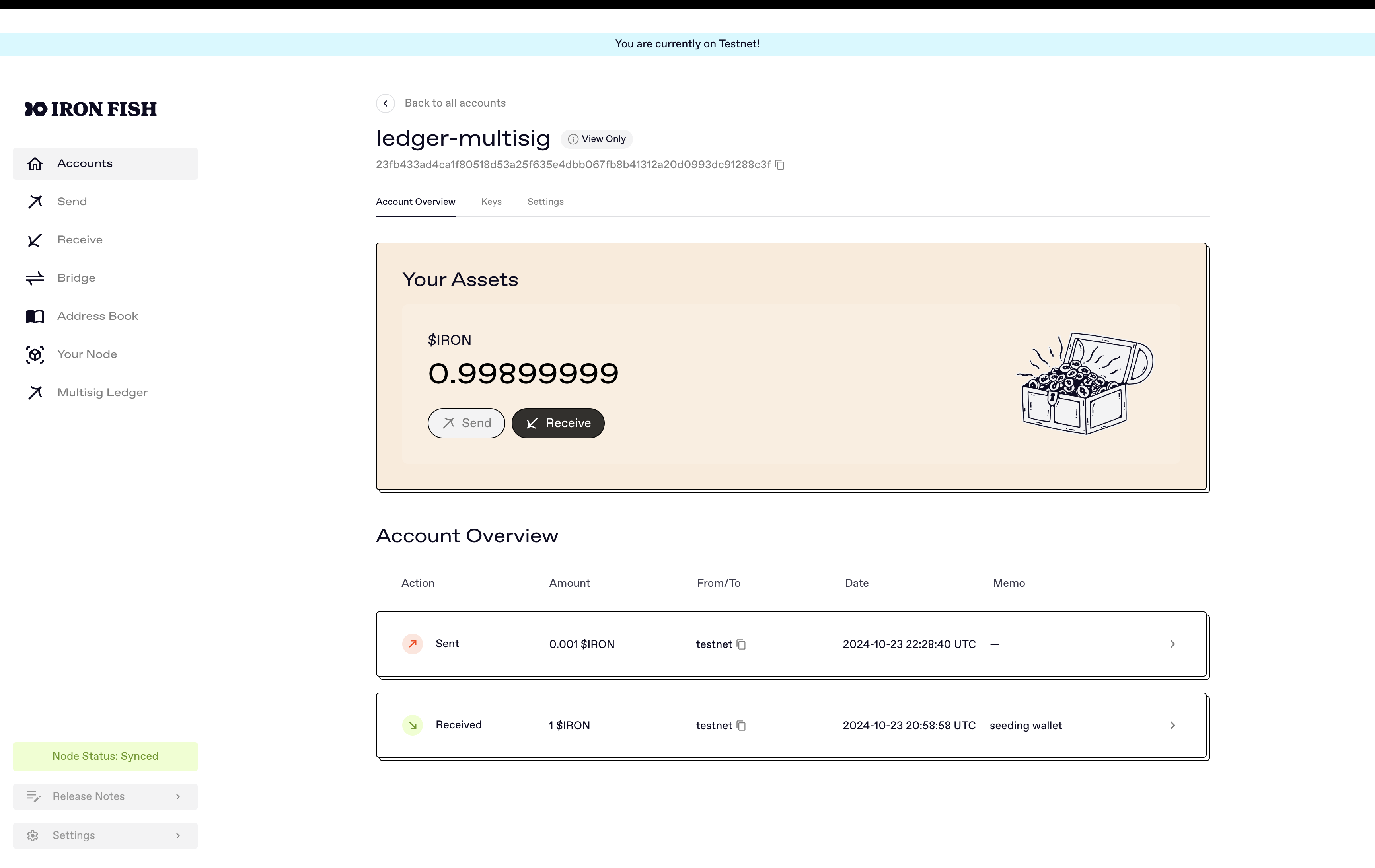 Please note that amounts in Iron Fish are displayed without decimal points, meaning that 1 IRON will be displayed as 10000000 since Iron Fish has 8 decimal points for precision.
