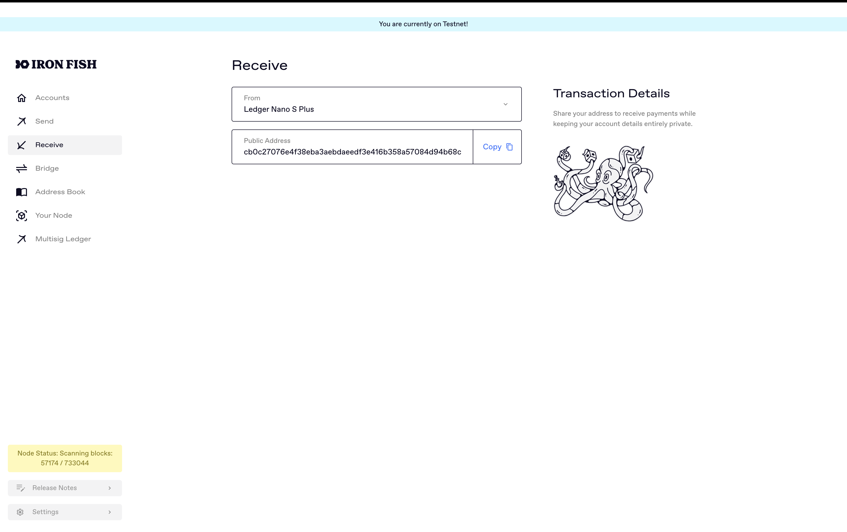 You’ll need the latest version of the Node App to see the balance, transaction history, and facilitate creating transactions for your Ledger wallet. Please make sure to always have your Iron Fish Node App up to date. Installing a new version will preserve all your chain and wallet history.